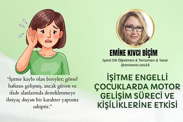 Emine Kıvcı Biçim İşaret Dili Öğretmeni & Tercümanı & Yazar @eminenin.sesi16 “İşitme kaybı olan bireyler; görsel hafızası gelişmiş, ancak güven ve ifade alanlarında desteklenmeye ihtiyaç duyan bir karakter yapısına sahiptir.” İşitme engeli, bir bireyin işitme kaybı derecesi ya da tipi ne olursa olsun, kişinin yalnızca dil ve konuşma gelişimini değil; Devamı